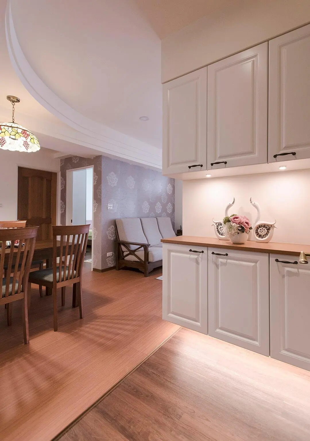 作品集 WORKER 首頁 作品集 住宅設計 微甜暖意|有溫度的法式鄉村風居宅 微甜暖意|有溫度的法式鄉村風居宅 住宅設計 格局 3房2廳2衛 成員 夫妻&小孩 風格 法式鄉村風 坪數 24坪 屋況 中古屋 地點 新北市林口區 建材 拆除工程、木作工程、水電工程、油漆工程、泥作工程、系統櫃、壁紙、木地板、玻璃、石材、冷烤漆 設計概念 DESIGN CONCEPT 全室以鄉村風為題,以法式鄉村風融入了現代簡約的筆觸,純淨的白作為空間基底,與溫潤的木地板圍塑出寫意溫暖的情境氛圍。優美弧線遊走在天花板,修飾橫樑的稜稜角角,讓視覺顯得柔和、放大許多;捨去過多繁複的裝飾性設計,僅利用簡約的線板造型 局部點綴在電視牆、櫃體門片等細節處,勾勒細膩優雅的空間表情,再搭配屋主喜愛的木質家具,成功打造溫馨甜美的鄉村場景。 ▼鄉村風的夢幻廚房▼ 夢幻廚房在我家!實現女主人嚮往的清新鄉村風 格局設計 Layout design 前後比對 Before and after design 其他作品 現代北歐風|多功能質感宅 10坪小宅:裝下生活的所有美好 輕奢之境|藝術與質感的大器空間 現代北歐風|展現俐落感的寵物宅 現代感透天|打造時尚品味生活 清甜感十足!繽紛的北歐童話宅